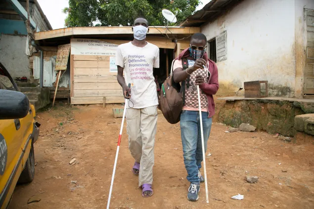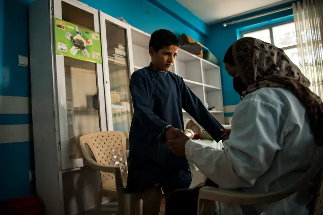 Prosthetics specialist and ICRC's former patient Mahpekay Sediqy fits Abdul Rashid (double amputee) for a new prosthesis at the Kabul Orthopedic Organisation (KOO). Abdul Rashid lost a part of a leg when a rocket-propelled grenade blasted when the grenade was accidentally brought home in 2018.