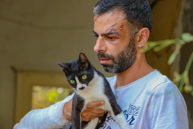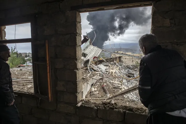 Over 30,000 people have been killed, more than 4,500 are missing, and thousands have been injured by landmines and unexploded ordnance. In the morning of 27 September 2020, both sides of the conflict resorted to using heavy weaponry in populated areas. Here a man looks out of what is left of a house from a window in a shelled residential building.