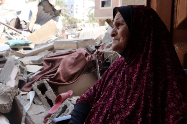 Nadia Shamalakh,73, sits by the ruins of her home, which was destroyed during the August 2022 armed hostilities.