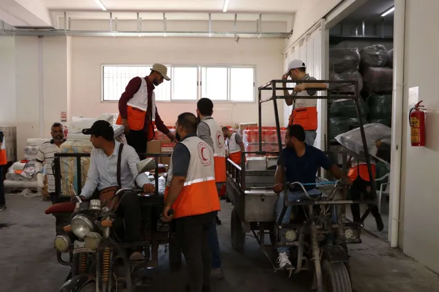 Distributing house-destruction support kits at the PRCS warehouse in Gaza. 14 August 2022.