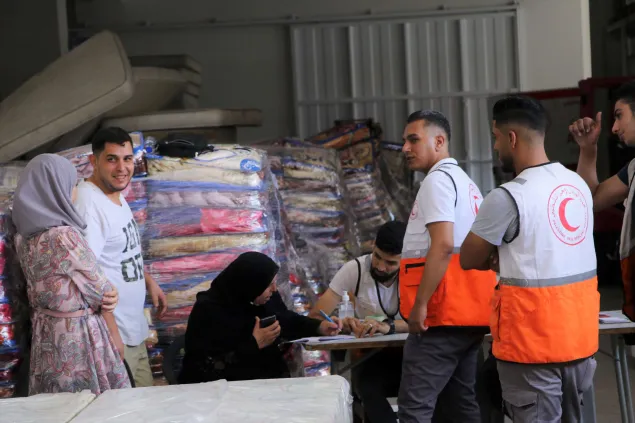The PRCS and ICRC providing in-kind support to one of the displaced families at the PRCS warehouse in Gaza City. 14 August 2022.