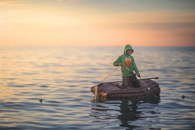 A child from Deir Al-Balah refugee camp in Gaza, is fishing despite his young age.