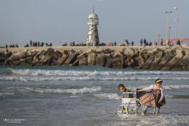 A child with disability plays on the beach with his sister who shares his joy and happiness. Despite the disability and the difficult living situation in Gaza, there is always hope.