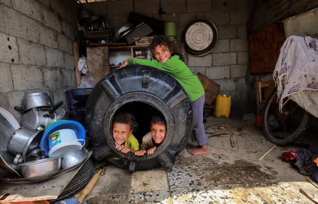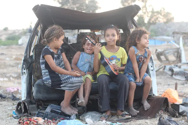 Children from Gaza sit in the trunk of an old car. They play music on a toy and enjoy the moment despite their poor living conditions.