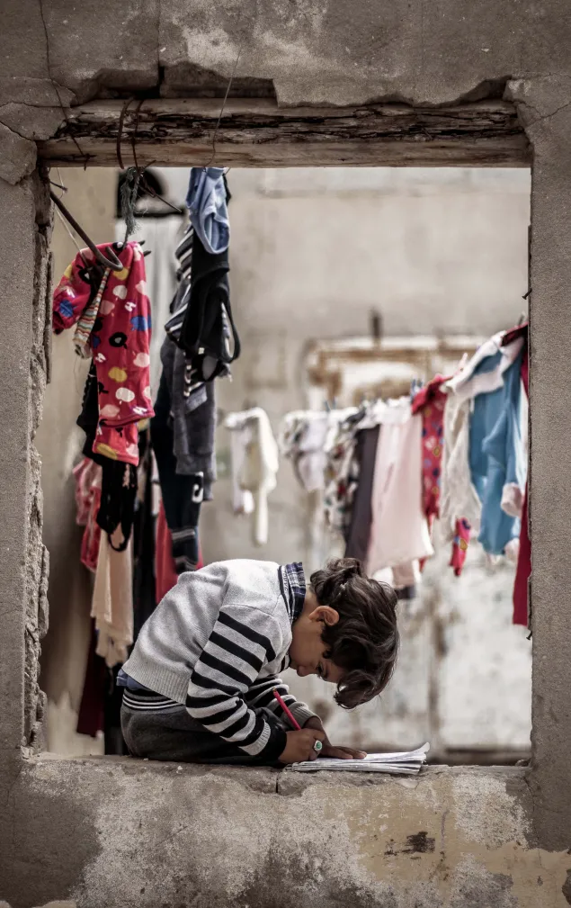 Children playing infront of their house seeking joy from the things around them. These kids lack toys and play grounds in light of the poor living conditions in Gaza.