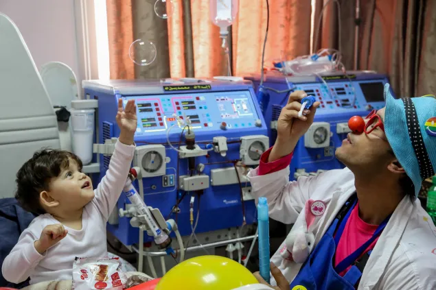 Mourad Mourad, AKA “doctor clown” entertains child patients in the kidney dialysis section in a local hospital in Gaza.