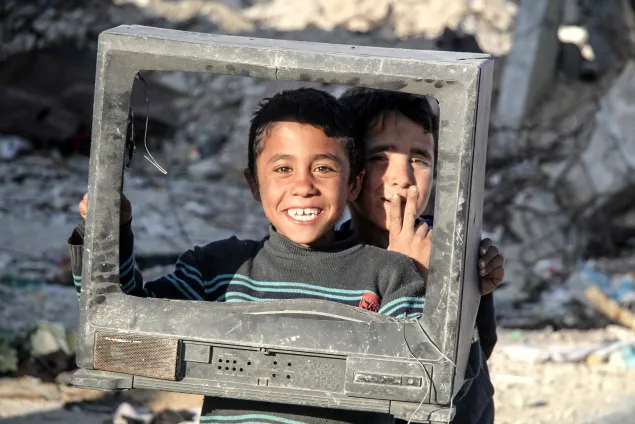 Two children, from the town of Beit Hanoun, north of Gaza, play with the frame of a destroyed television device.