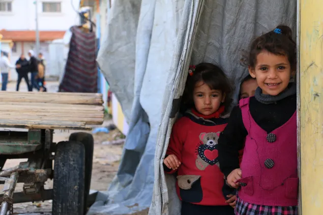 Marah and Hadeel lost their father and younger brother during the recent conflict in Gaza. They currently live in a caravan that lacks even the minimal living needs. One of them is seen with a smile on her face, while the other seems to display doubt.