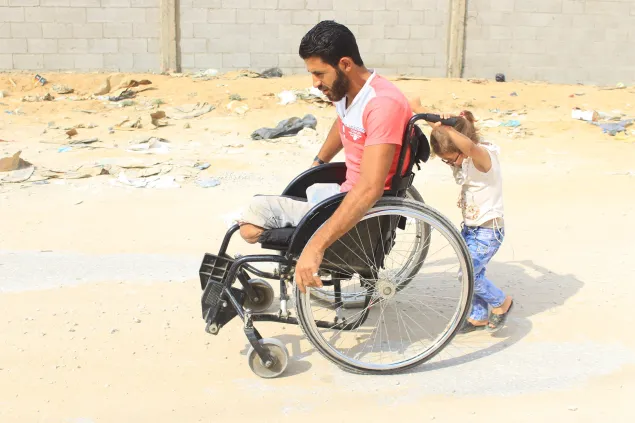 Ibrahim lost his legs during the recent conflict in the Gaza Strip. However, he tries to remain hopeful. His six-year-old daughter pushes him on his wheel chair as they spend time together. He does some basic construction work despite his disability.