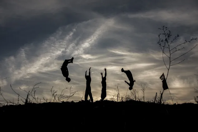 A group of young men performing parkour stunts at the eastern borders of Khan Younis. Due to the scarcity of playing areas and limited resources, they are forced to practice their sport in the empty areas near the borders.