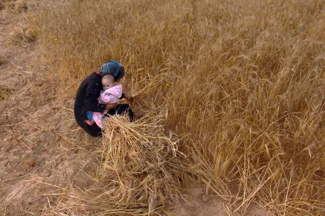 A Palestinian woman helps her husband during the wheat harvest. She carries her baby in one hand and works with the other.
