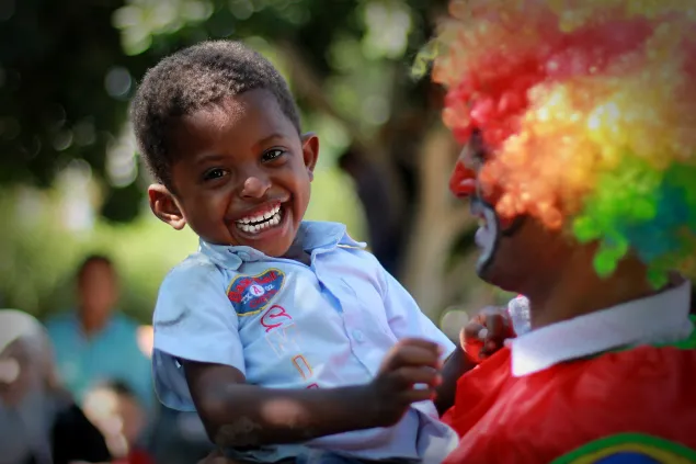 A child is being entertained by a clown during a recreational activity organized for children with cancer in Khan Younis.