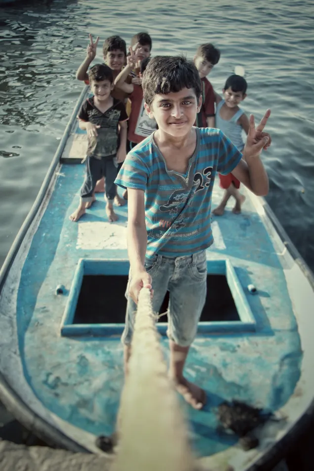 Children from Gaza are preparing to leave for a sea tour on their boat.
