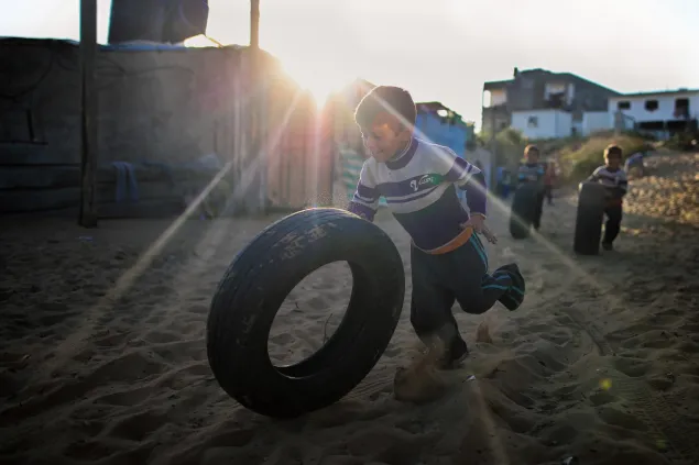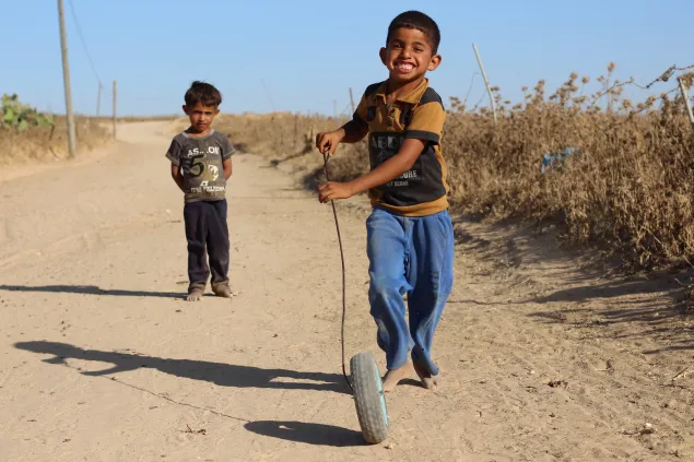 Raees is a deaf boy who doesn’t stop smiling despite his disability. He plays with a wheel and a stick with his brother, in east of Jabalia, near the borders, where they reside in tents.