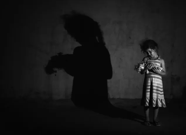 A Palestinian girl plays with her doll during the power outage. Gaza suffers from power cuts reaching up to 20 hours a day.