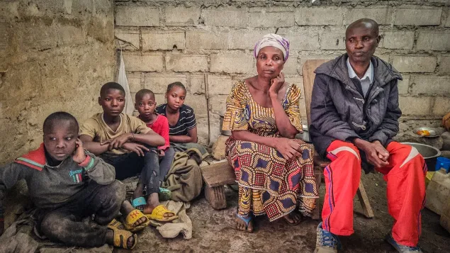 Mukandirwa Balanda Hangi, displaced from Kichanga, with his wife and eight children. Since the end of February 2023, they have been living in a house, still under construction, provided by his cousin.