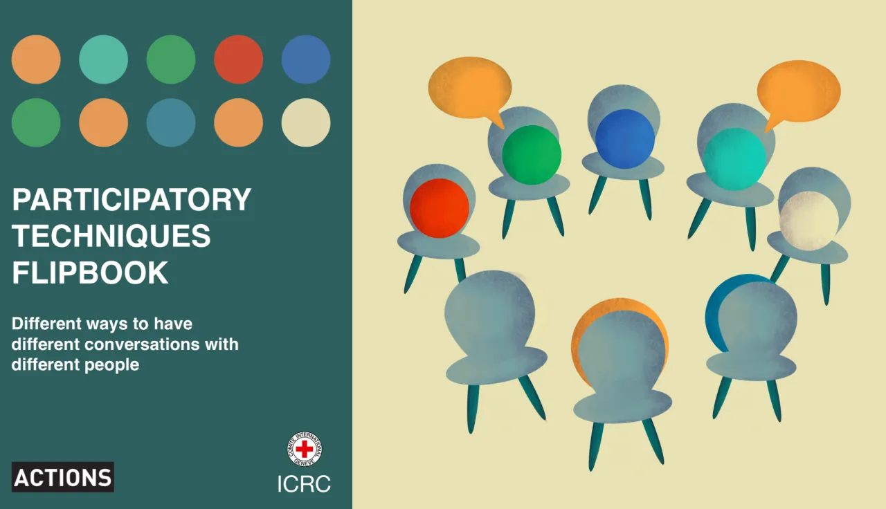 Situations like these are why the ICRC put together the Participatory techniques flipbook. The flipbook contains dozens of one-page techniques, which can be used to build trust or break the ice; map out or identify issues; and analyze or dig deeper into issues. Icons on the top left of each page indicate if a technique can be used with illiterate participants, if it can be adapted to younger audiences, or if it can be used to discuss sensitive issues.