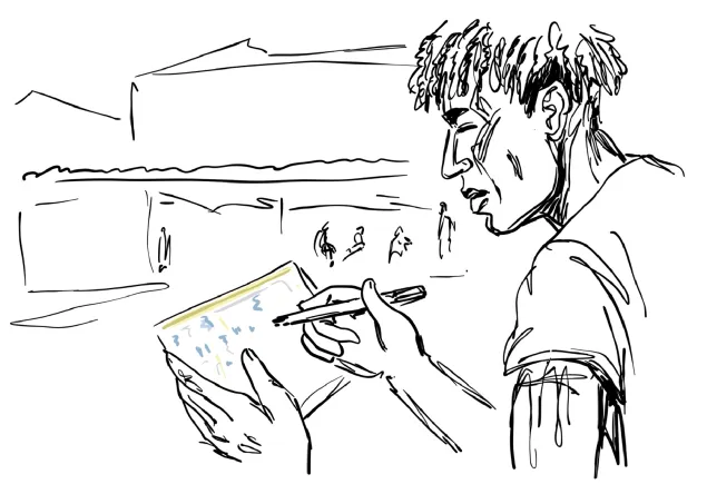 The day centre brings together several associations and the courtyard is buzzing with activity. This is where phones are charged and clothes are washed. People dodge the stray ball from an impromptu game of football. Red Cross volunteers and nurses pass by. A service to call family back home is also on offer. A young man is drawing the coloured concrete wall that surrounds the courtyard. He has drawn the top of the wall right along the edge of the paper, leaving the sky as an abstract notion – a bit like hope.