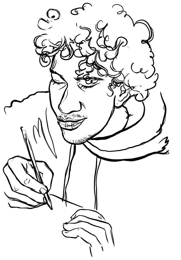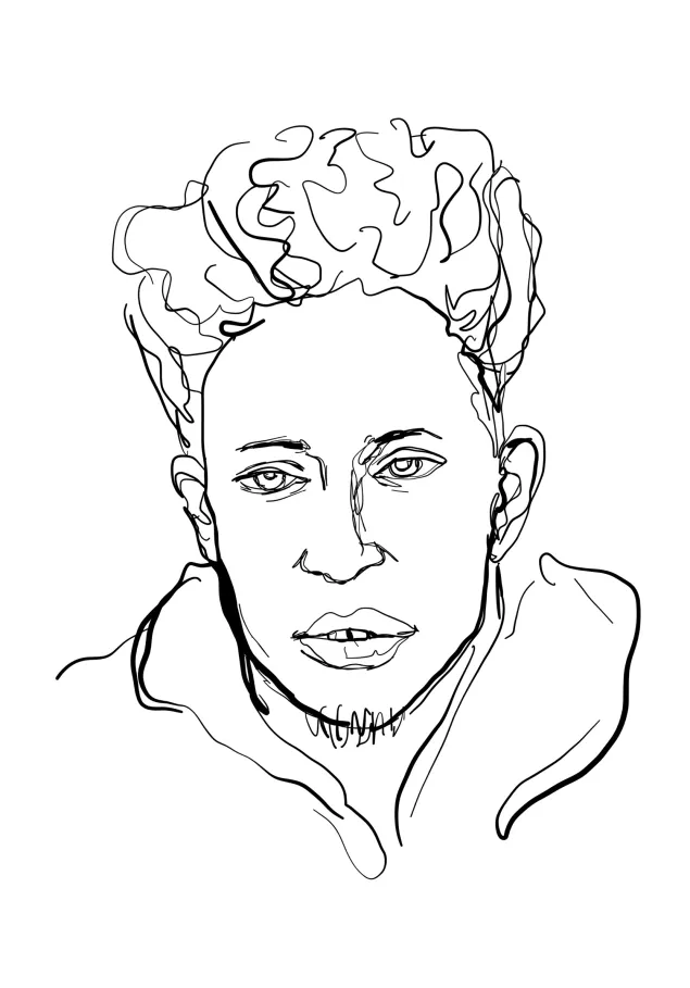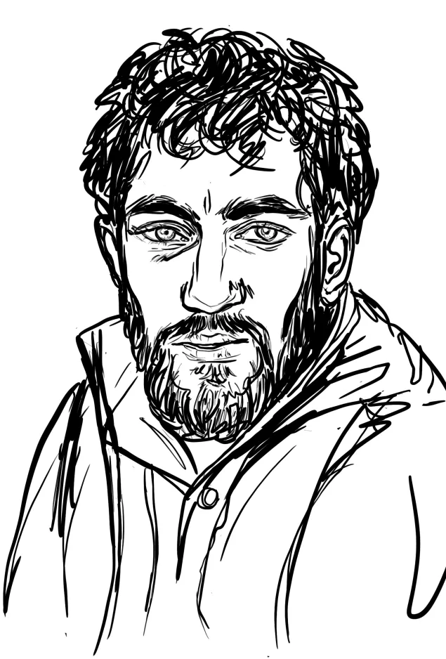 A quiet, solemn man stands in line. He lets himself be sketched, seeming indifferent. In a few quick strokes, his image and strain are captured on paper. He takes the drawing, glances at it and then hands it back, his face expressionless. He walks away but then turns and reconsiders the drawing. His face softens and he breaks into an unexpected smile.