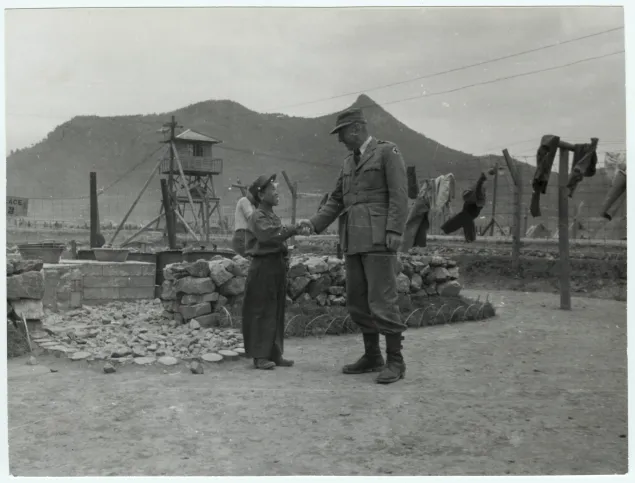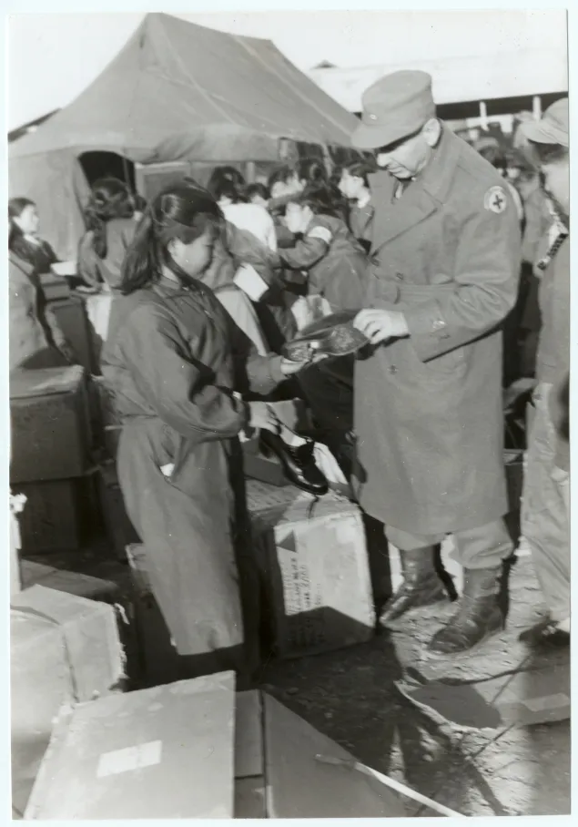 A female PoW receiving shoes from the ICRC delegate at Geoje Camps.