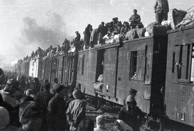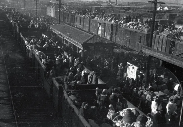 A crowd of refugees ride on trains in a photo taken on 29 December 1950.
