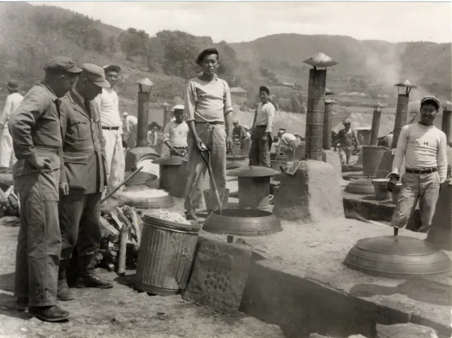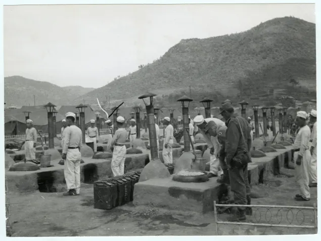 People prepare food for PoWs at the Geoje camp on 5 June 1951.