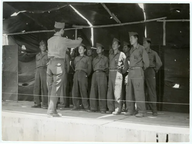 A small group of PoWs sing together at the Geoje camp in June 1951.