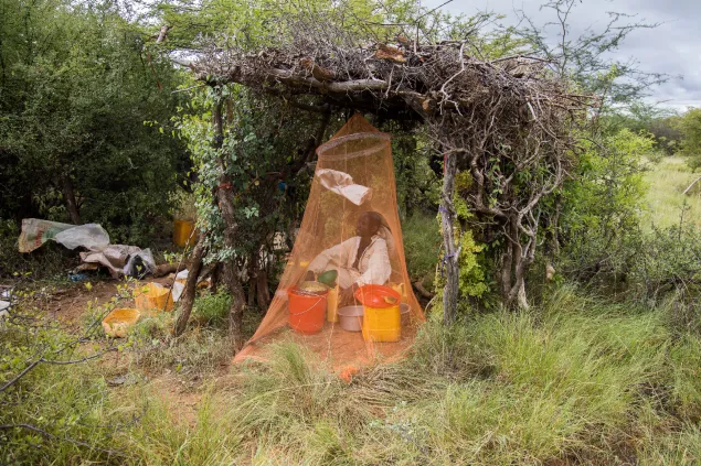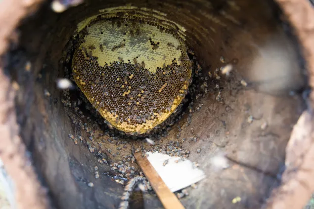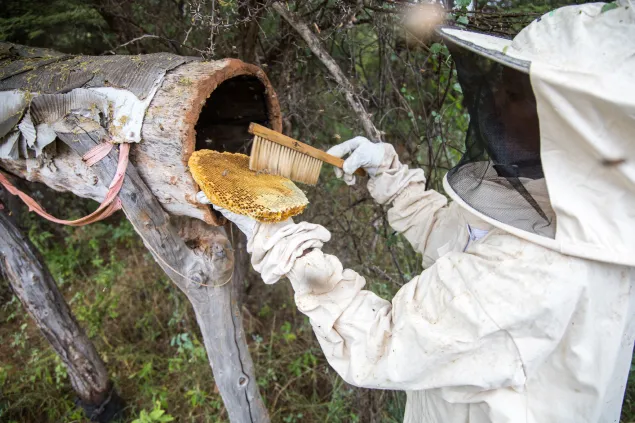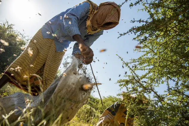 Ali Mohamed, 37, gathers a swarm of bees for relocation to a new hive. Honeybees are at their most docile when swarming. At this stage, they are looking for a home and do not have honey and brood (eggs, larvae and pupae of honeybees) to protect.