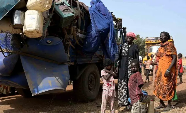 A group of Sudanese refugees gets off a truck upon arrival in Boro Medina, a small town in South Sudan with a population of about 5,000. Due to the town's remote location and poor road conditions, access remains a challenge, particularly during the r