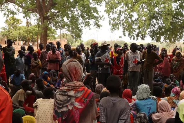 The ICRC and the South Sudan Red Cross society teams engaging with a group of people ahead of a distribution of humanitarian assistance.