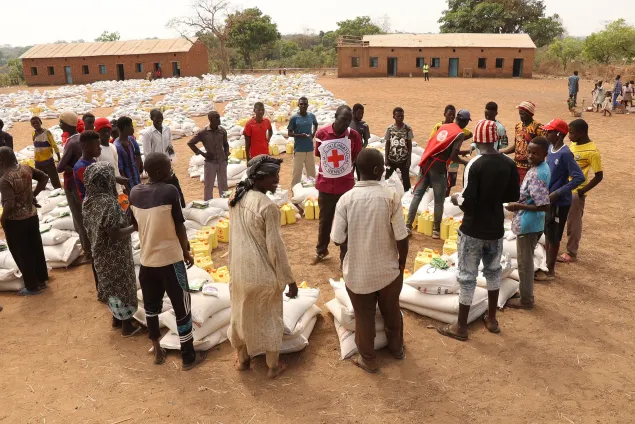A group of refugees and returnees receives food and other items. Essential household items (EHI) were distributed to 2,300 households to alleviate some of their most urgent needs.