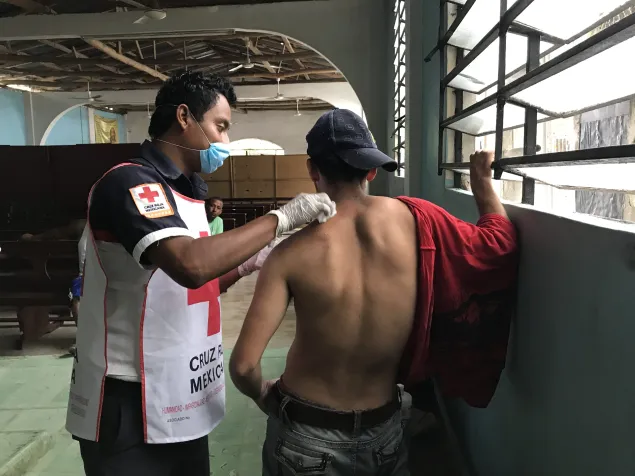 Byron Vásquez, a volunteer from the Honduran Red Cross, provides pre-hospital care at the aid station in Corinto, Honduras. The young man pictured has recently been repatriated but needs medical attention before returning home.