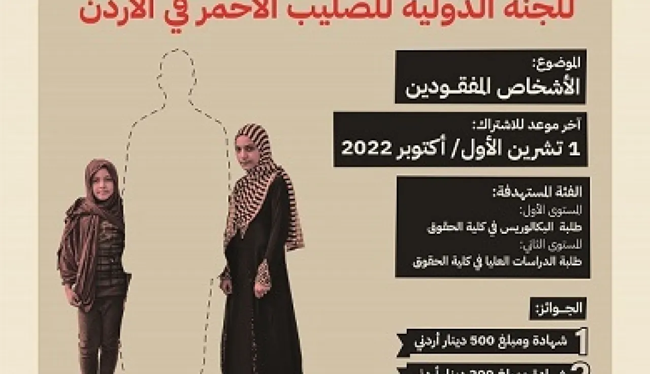 تتشرف اللجنة الدولية للصليب الأحمر في الأردن أن تنظم المسابقة البحثية الأولى لكتابة مقال عن القانون الدولي الإنساني بغية إشراك طلاب القانون في مناقشات القانون الدولي الإنساني ذات الصلة وتوفير منصة أكاديمية للنقاشات القانونية.