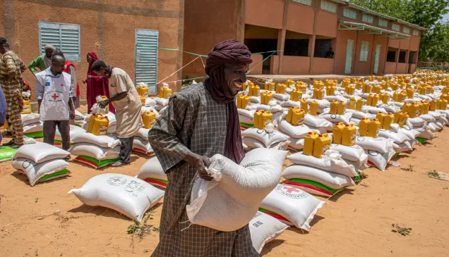بلدة كاباليوا، مقاطعة نغيغمي، منطقة ديفا، النيجر. نازح بسبب أعمال العنف التي هزت مدينة بوسو وهو يتلقى كيسا من المؤن الغذائية قدمته اللجنة الدولية.