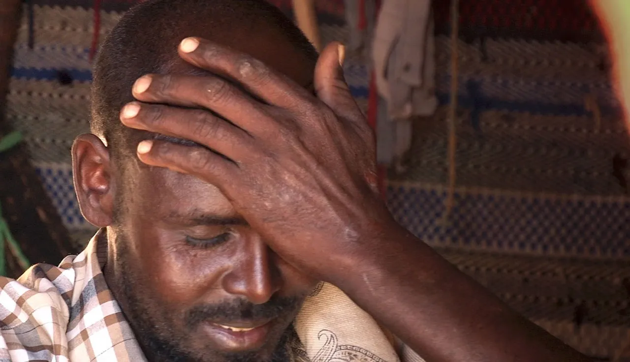 داخل كوخ منعزل من القش يطلّ على مجرى نهر جاف، يجلس عبد الله ومعه أصغر ثلاثة من أطفاله. يرتسم البؤس على صفحة وجهه. والبيت يخلو من الطعام.