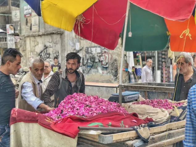 Auf dem beliebten Aljamilieh-Markt verkauft ein Mann Blütenblätter für die Zubereitung von Marmelade und Kräutertees. Viele Menschen in Aleppo verloren durch den Krieg ihre Arbeitsstelle und versuchen nun, irgendwie ein Auskommen zu finden.