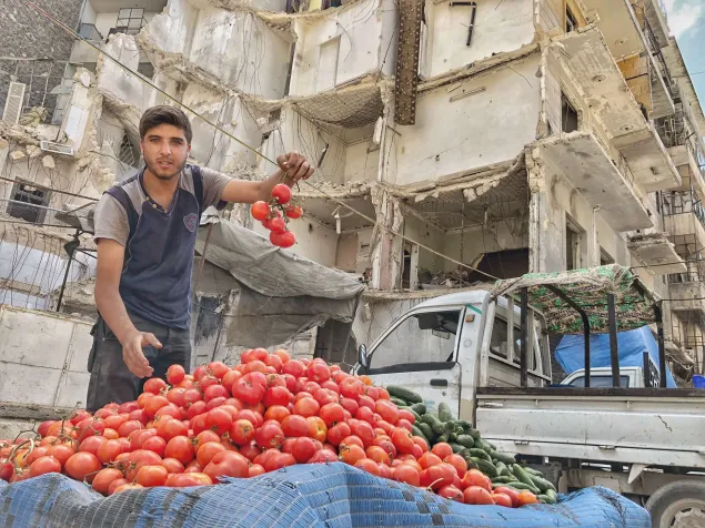 Dieser Mann verkauft Tomaten; im Hintergrund sind zerstörte Häuser zu sehen.