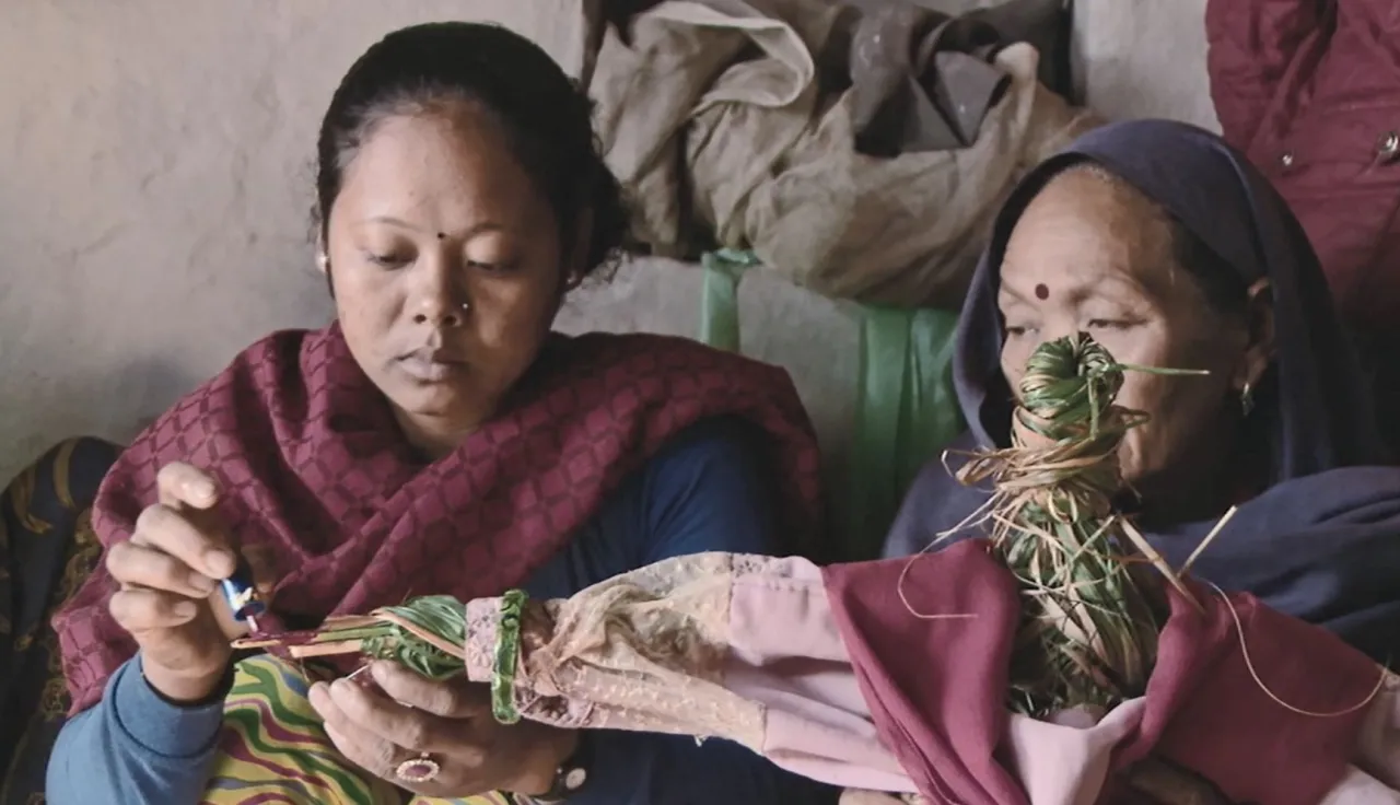 Bhojali Chaudhari hält eine Puppe fest, die ihre vermisste Tochter darstellt. Der Tradition entsprechend ist die Puppe aus heiligem Gras gefertigt und mit den Kleidern ihrer Tochter bekleidet. CC BY-NC-ND / ICRC