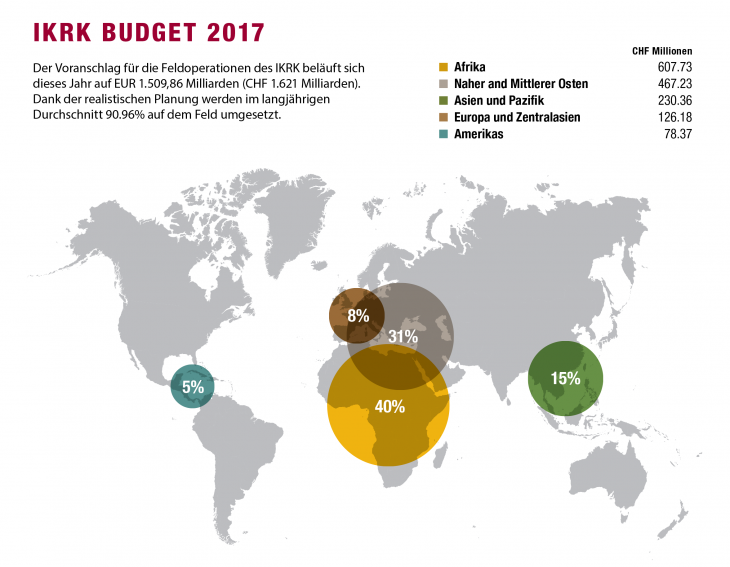Das Internationale Komitee vom Roten Kreuz (IKRK) benötigt 2017 1,6 Mrd. Schweizer Franken (1,6 Mrd. US-Dollar/1,5 Mrd. Euro) zur Deckung der Kosten seiner Arbeit vor Ort. Das IKRK finanziert sich ausschliesslich aus freiwilligen Beiträgen der Vertragspartner der Genfer Konventionen, der nationalen Rotkreuz- und Rothalbmondgesellschaften, privater und öffentlicher Quellen sowie supranationaler Organisationen.