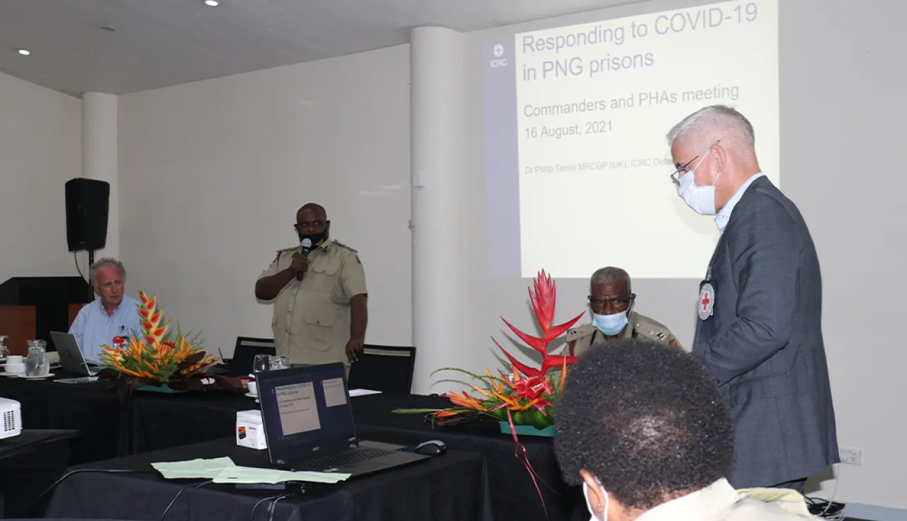 ICRC has been supporting a technical working group, including representatives from the National Pandemic Control Centre and the National Department of Health, and advising the CS headquarters. The group has steered publication of a 30-page plan that sets out the infection prevention and control measures a prison can implement to reduce the chance of COVID-19 getting into a prison in the first place and, if those defences are breached, how to prevent one case from becoming a major, and potentially fatal, outbreak.