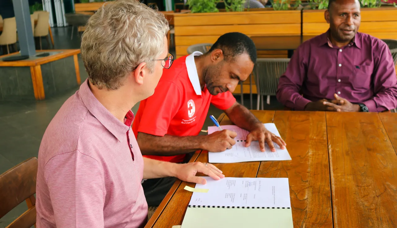 Representatives from the ICRC and PNGRCS signing the agreement in Port Moresby.