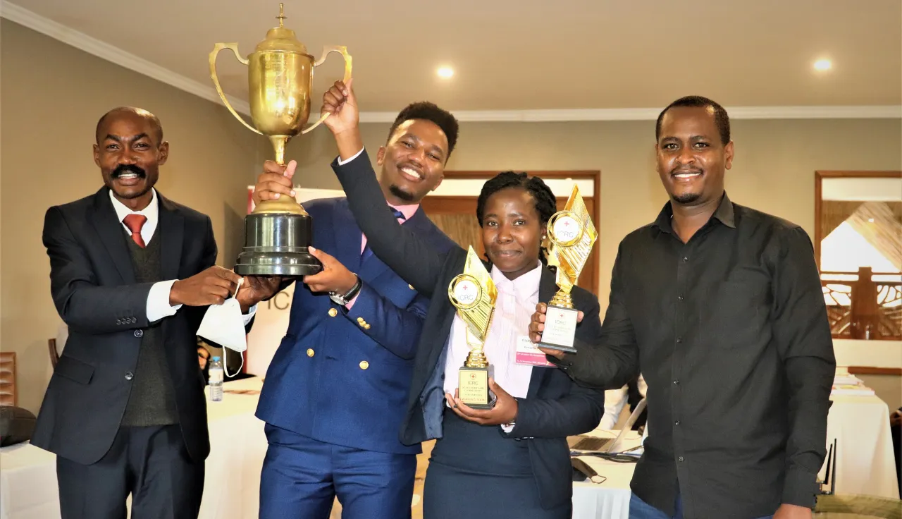 In a final debate round, the students showcased their knowledge of international criminal law, arguing for and against the prosecution for war crimes of a fictional character before a judging panel consisting of ICRC legal experts and invited judges. The winning team members were Raphael Gitau and Gladys Nyangweso from Kenyatta University.
