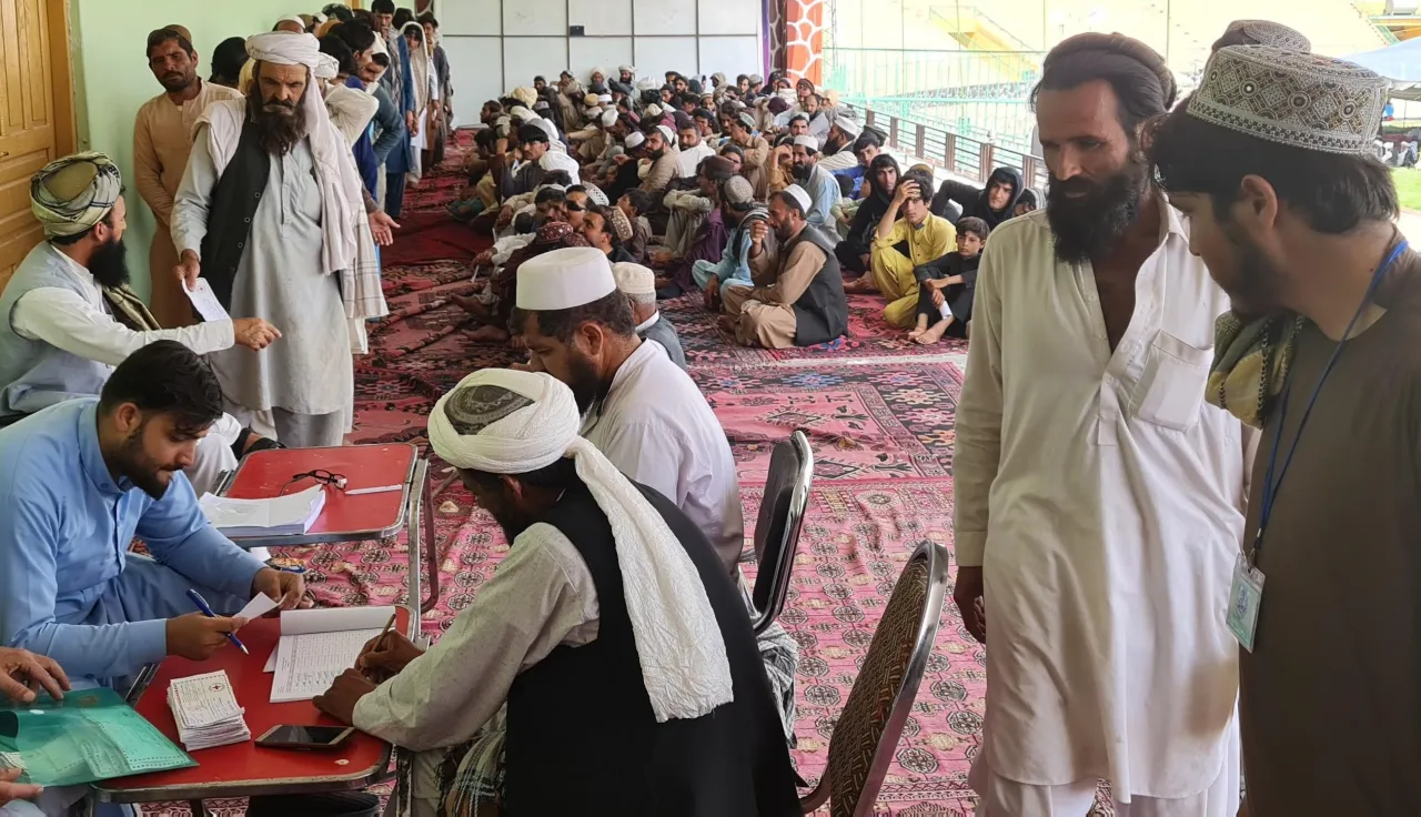 People from Woch Khwara gather at a stadium in eastern Khost Province, Afghanistan, to receive multipurpose cash grant.