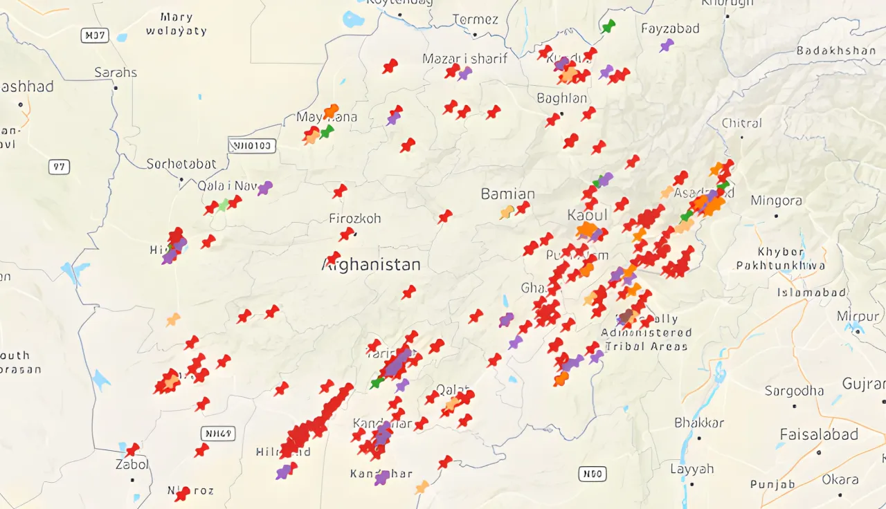 A map of Afghanistan showing the number and location of incidents related to landmine and UXO explosions between January 2022 and March 2023. GRAPHIC: ICRC