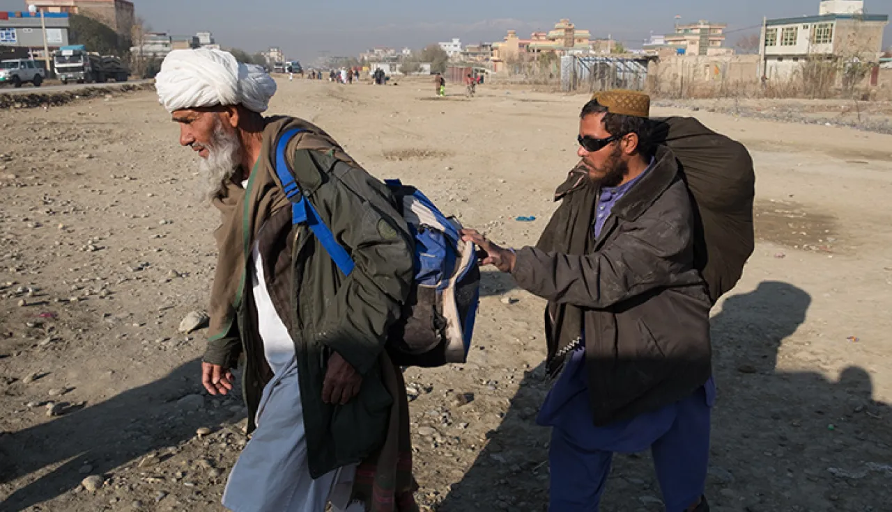 Allah Noor and Jamal Sardar wait after leaving their mobile phones at the first security point at the prison entrance. CC BY-NC-ND / ICRC / Olivier Moeckli