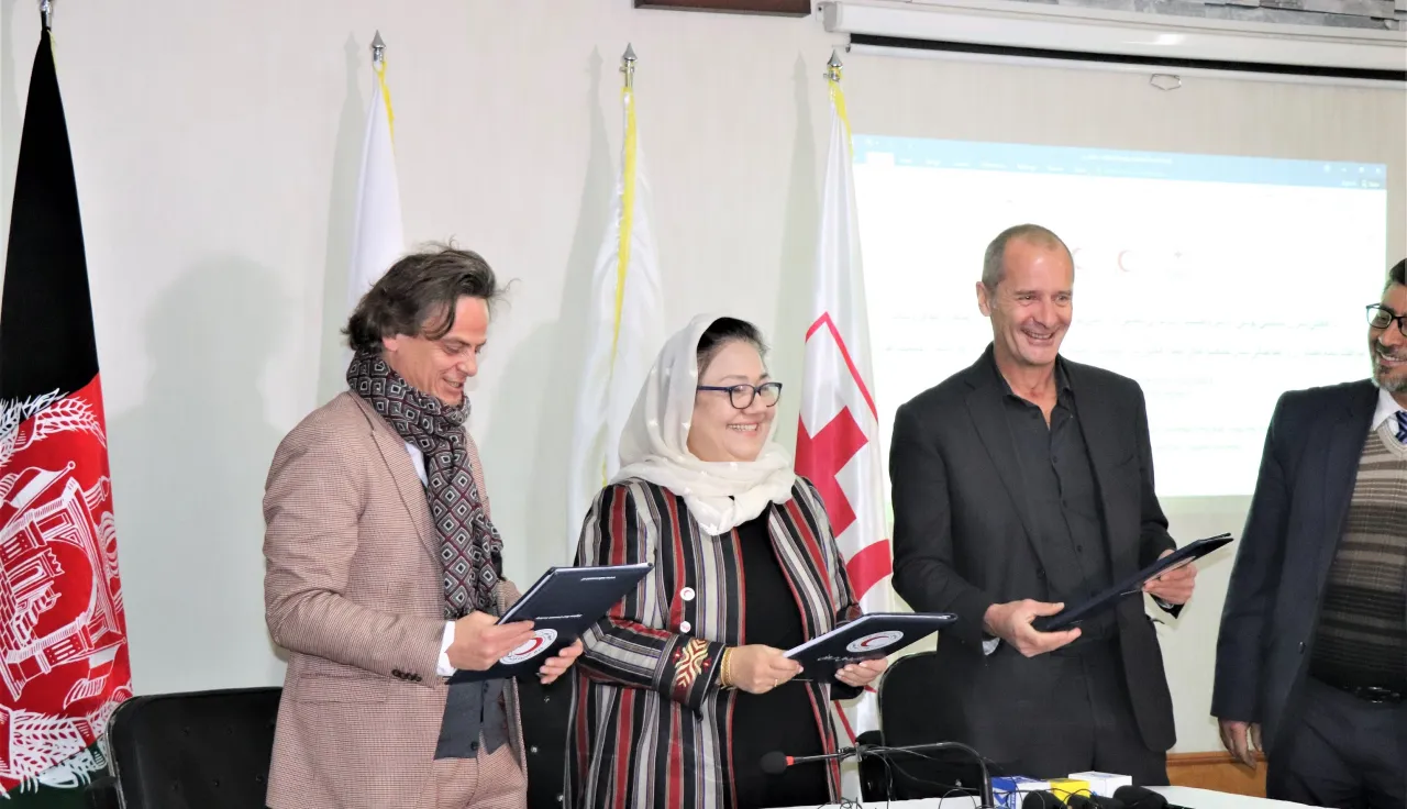 Mr. Juan Pedro Head of Delegation for ICRC, Dr. Nilab Mobarez the Secretary General of Afghanistan Red Crescent Society and Pierre Kremer, Head of Delegation for IFRC signing the MoU. Masoud Samimi/ICRC