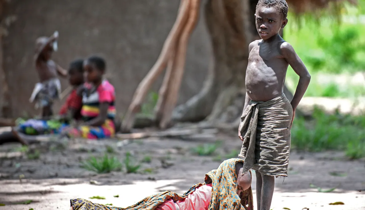 Around 50 small huts of earth and straw make up Mukambwe. But no cooking pot bubbles before them, no family gathers to share a meal. The children, skinny and wary, wander aimlessly. There are no smiles, no cries, no games. Just empty stomachs. The signs of malnutrition are clear.
