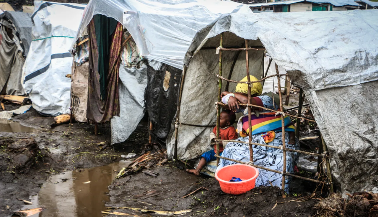 This particular camp, which hosts thousands of displaced people, is just a stone's throw from another camp providing refuge to people who had fled the eruption of Mount Nyiragongo in June 2021. The conditions here are far from sanitary, and only get worse when it rains. Rainwater frequently floods the small makeshift huts that serve as shelters for people unable to find space in schools, churches or other camps, leaving the occupants vulnerable to disease. Indeed, cases of cholera have been reported at the site.