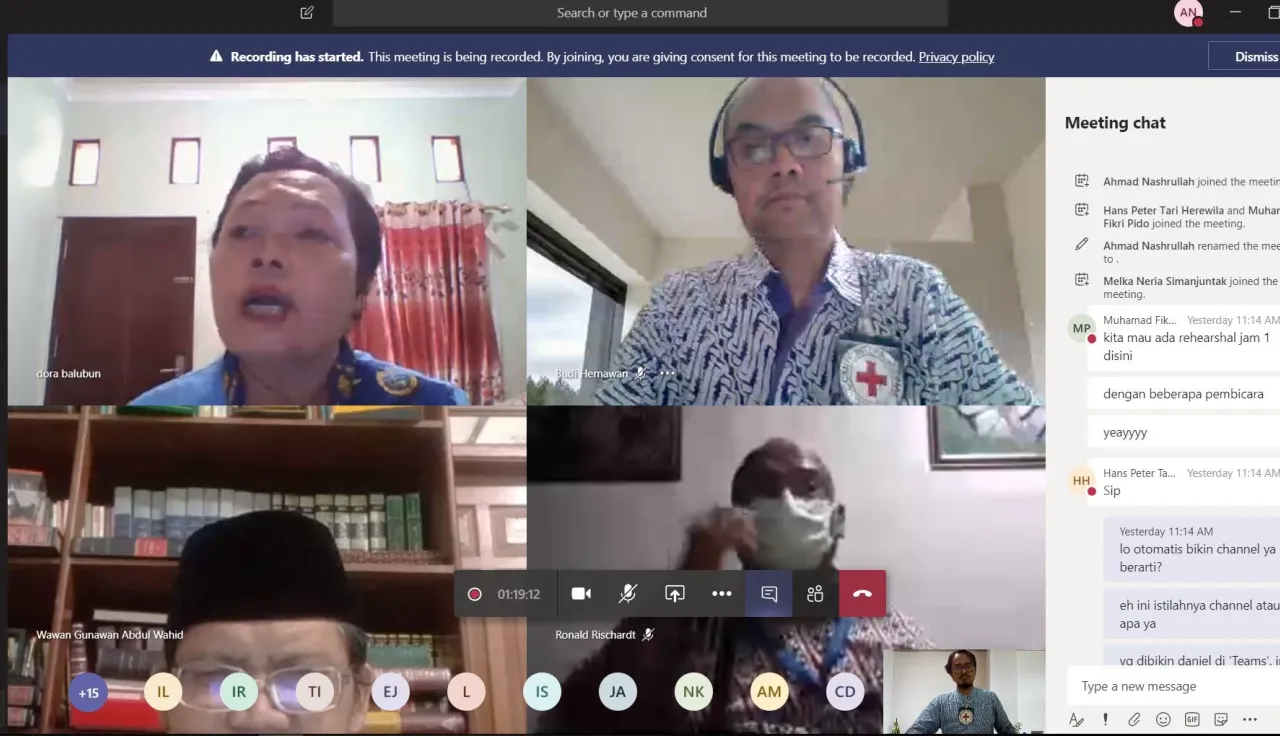 The webinar was conducted by the ICRC regional delegation for Indonesia and Timor Leste on 13 May 2020, and featured six major religious leaders: KH Wawan Gunawan Abdul Wahid (from Majelis Tarjih dan Tadjid PP Muhammadiyah); Hong Tjhin (from Buddha Tzu Chi); Liem Liliany Lontoh (from the Indonesian Confucian Council, MATAKIN/Majelis Tinggi Agama Khonghucu Indonesia); Rev. Dora Balubun (from the Synod of the Evangelical Christian Church in Papua); Fr. Pius Barces CP (from Catholic Archdiocese of Pontianak in West Kalimantan) and I Nyoman Suartanu (from the Indonesian Hinduism Society, or Parisada Hindu Dharma Indonesia). The webinar was moderated by Budi Hernawan from the Global Affairs team of the ICRC in Jakarta.