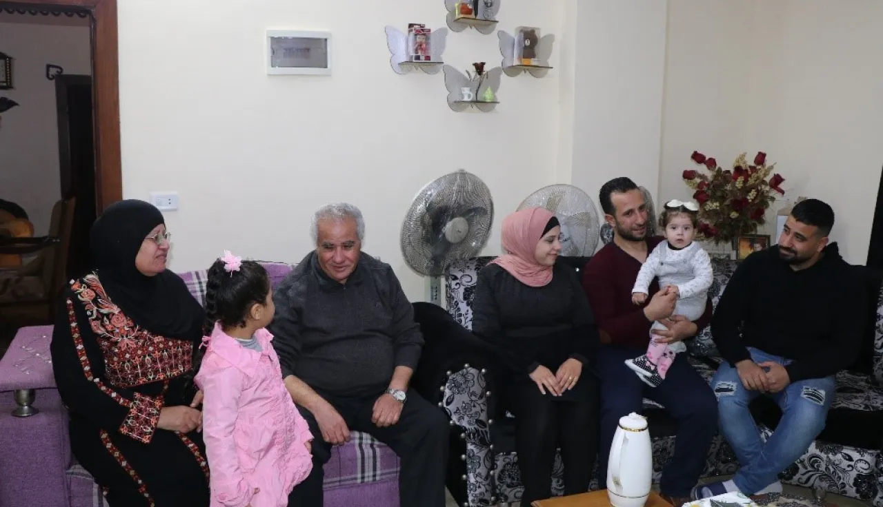 Youssef Nazzal, Basma Nazzal their grandchild and an ICRC staff after both husband and wife were reunited following an 18-year separation.